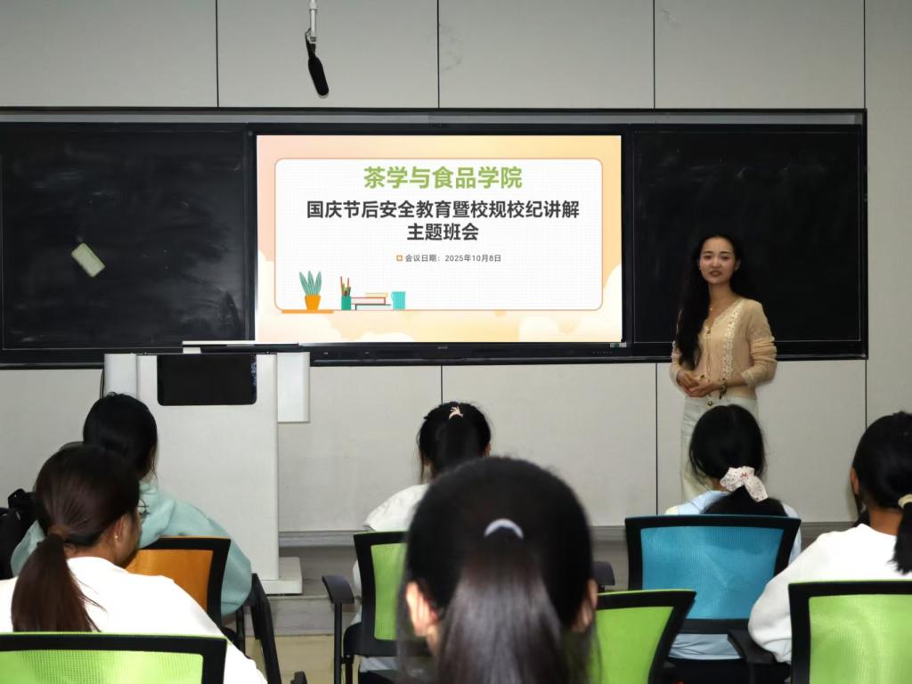 为建牢校园平安防地,强化学生的老实认识取行为规范,保障节后教育讲授次序平稳有序,10月8日晚7时,茶学取食物学院于教九楼108教室召建国庆节后平安教育暨校规校纪从题班会。本次会议由专人员耑妍掌管,全体学生积极参取。